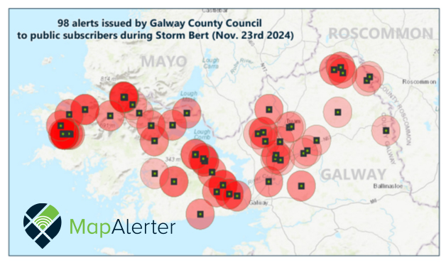 MapAlerter offers free SMS, email and app notifications from Galway County Council for localised severe weather events including fallen trees, power lines and other obstructions that might occur during storms. Apart from severe weather, MapAlerter also provides a free alert service for Galway County Council for planning applications, commencement notices, river sensor heights, bathing water quality notices, and much more. One of the busiest days for Galway County Council on Mapalerter was Storm Bert (November 2024) when they issued 98 fallen tree, flood and hazard warnings to members of the public via MapAlerter's free alert service.